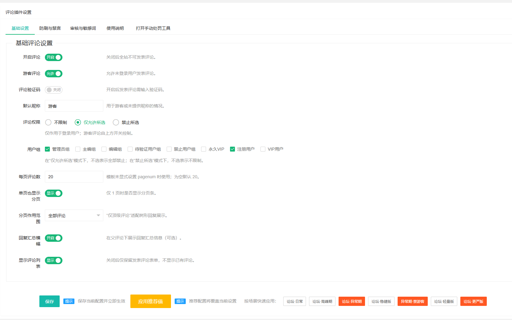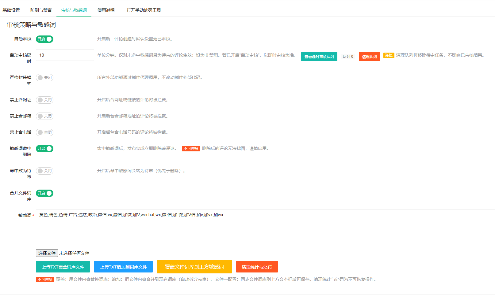功能范围:本页集中配置评论的审核策略、敏感词词库、速率限制与禁言/封禁等管理功能。