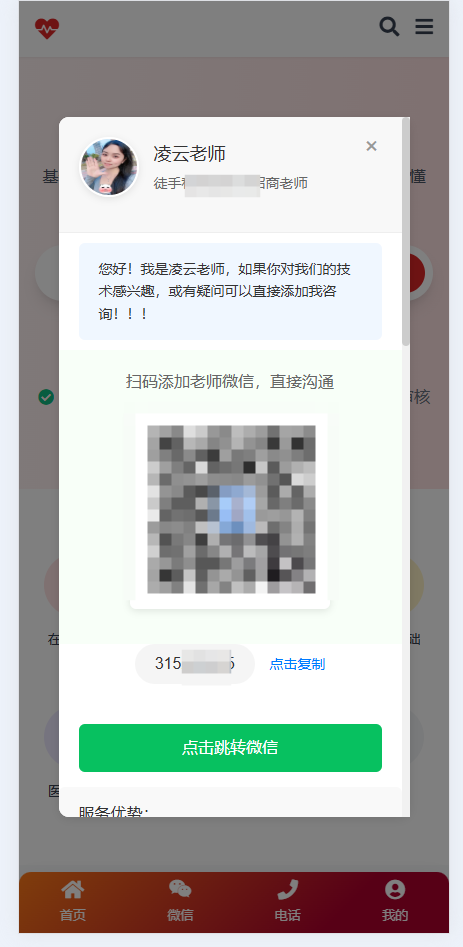 底部导航客服插件微信客服插件,点击微信图标触发弹窗,显示客服信息和二维码(启用插件直接在底部调用这个标签就可以直接用{block:wechat_bottom_nav} {@$data} {/block})